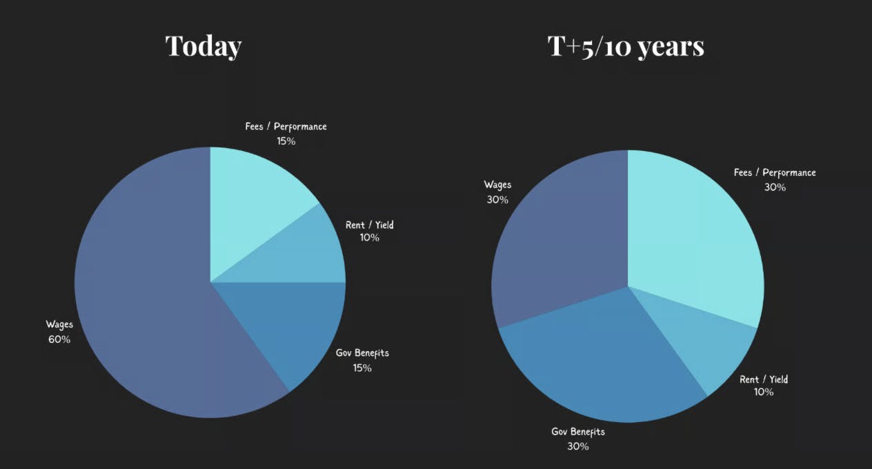 Wages could drop from ~60% → closer to30–35% of total household income.